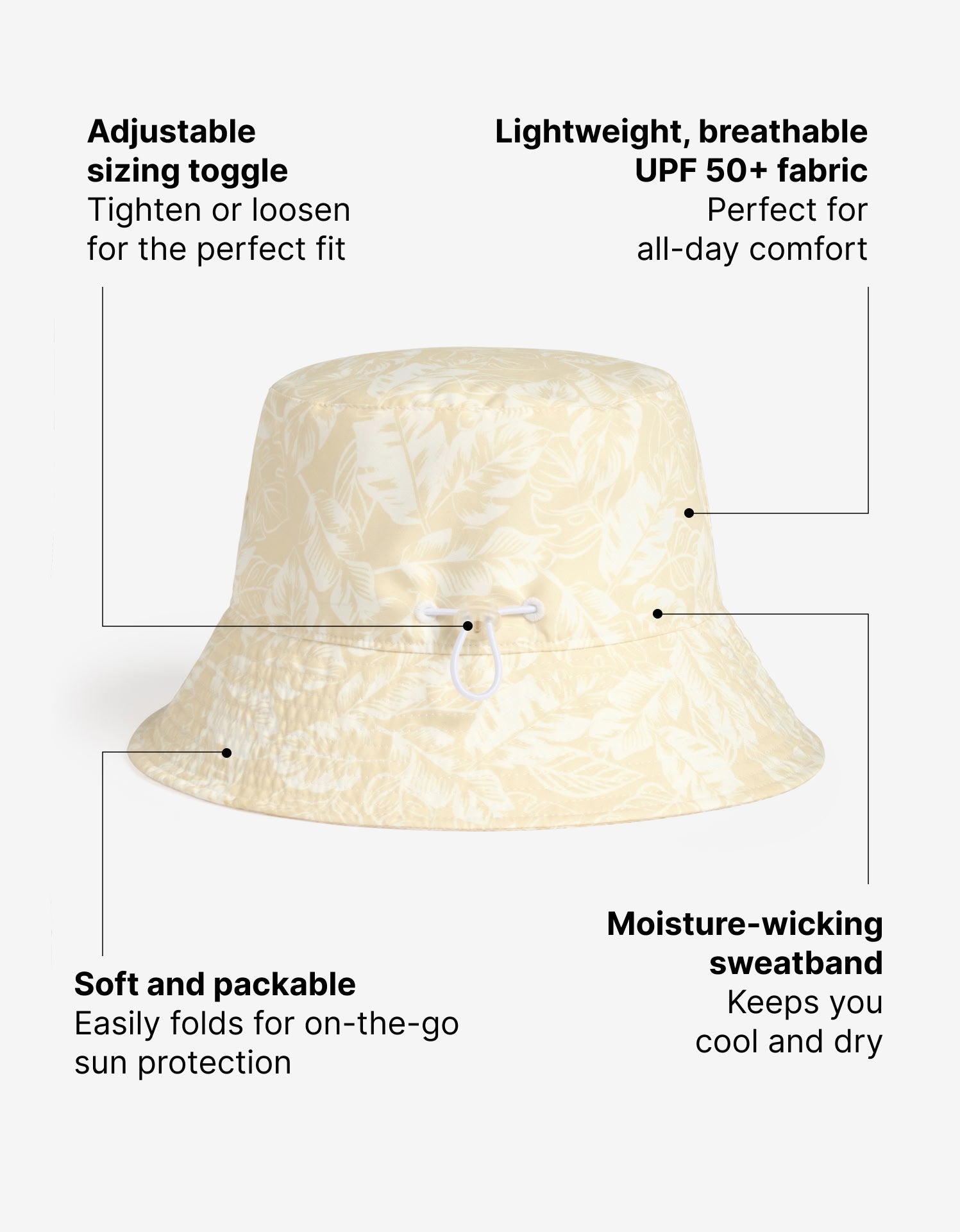 Crafted from soft, lightweight fabric, this bucket hat is exceptionally comfortable and durable. It folds down easily for convenient storage in your bag.
