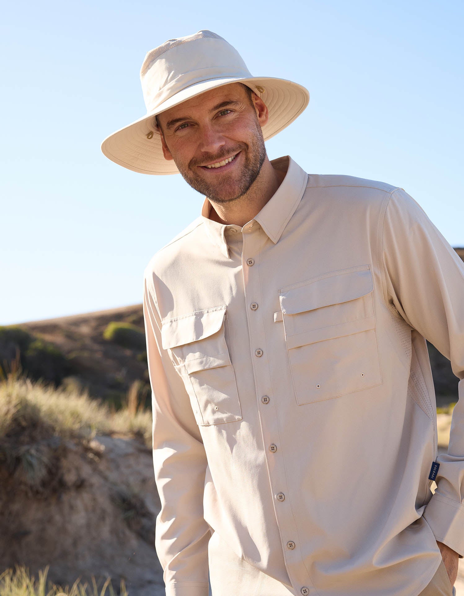 The Everyday Broad Brim Sun Hat offers UPF 50+ protection with a 3.25" (8 cm) wide brim, lightweight fabric, breathability, and a convenient internal small storage pocket.