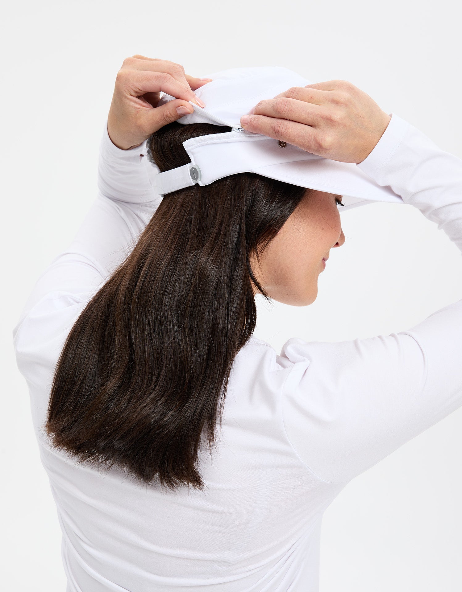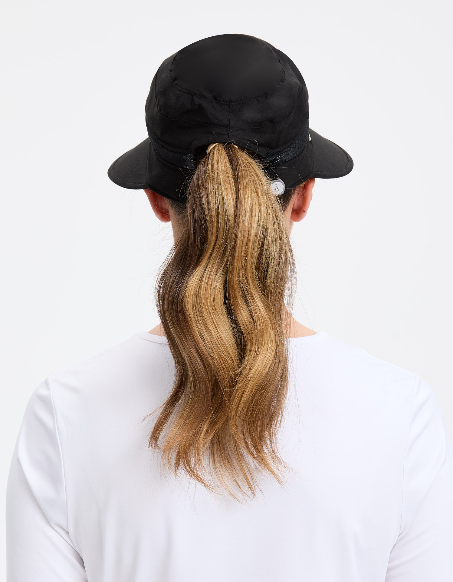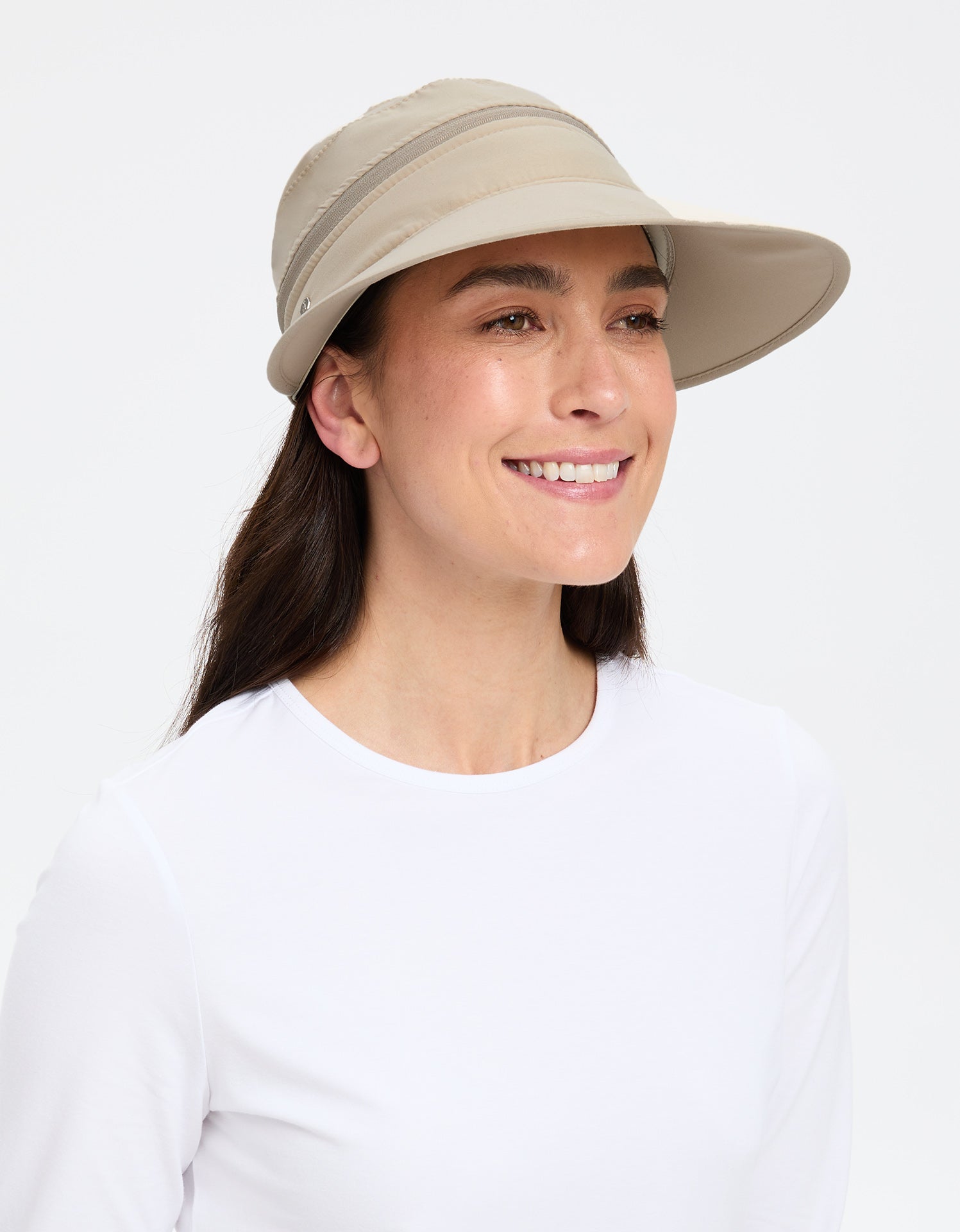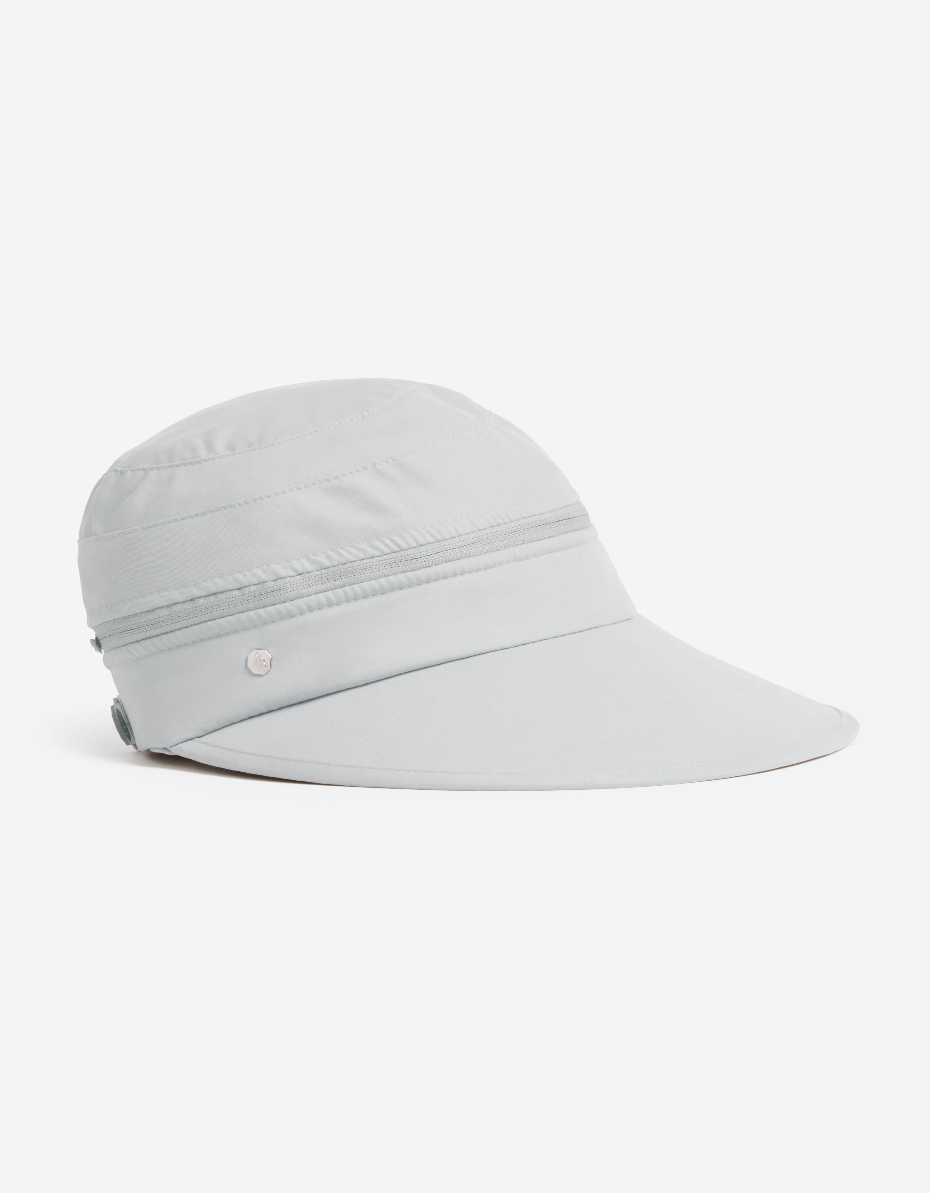 Our convertible Wanderlust Visor can be worn as a cap or visor by easily unzipping the top section. The visor provides sun protection with a 3.5" (9 cm) brim at the front. It features a moisture-wicking sweatband and an adjustable strap.